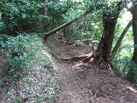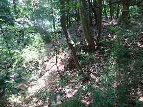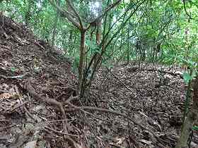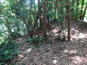 南側には堀切の跡があるが、壁面が崩れてしまったのか、だいぶ緩やかなものになってしまっている。
