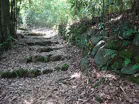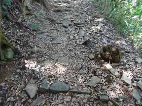 | 最初は石段の道が続く。 | 途中からは石畳道だったようだが、石がはがれてゴロゴロしている。 |