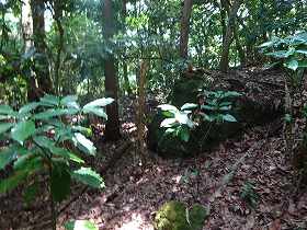 さて、肝心の城址であるが、これがまたよく分からない。登山道の途中に、やや堀状にくぼんだところが2カ所見られたのと、登山道に沿って城塁的な側面部が見られるぐらいである。