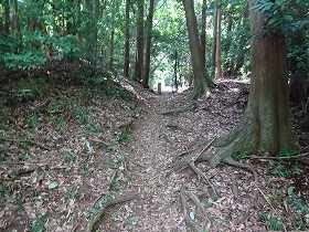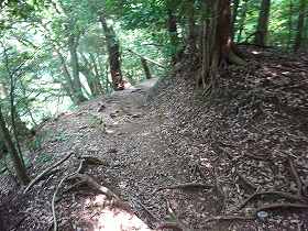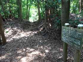 このように思ったほどきつくない山道を15分ほど登っていくと、尾根上に到着した。切り通しの通路があって、城内に進入したことが分かる。