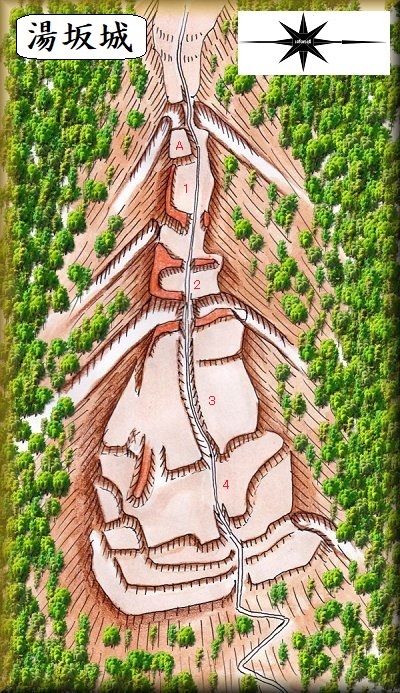 箱根湯本の街の西方にそびえている比高160mほどの湯坂山が湯坂城の跡であり、地図にも掲載されている。