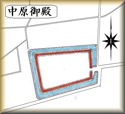 中原御殿は、御殿二丁目にある平塚市立中原小学校のあるところに建てられていた。小学校の建設によって遺構は失われてしまっているのだが、明治時代の陸軍迅速測図を見ていたら、当時は遺構がよく残っていたらしく、その形状がしっかりと描かれている。それを基にして作図したのが右の図である。その規模は東西140m、南北100mほどの長方形の区画であったようで、土塁と堀とが巡らされていた。