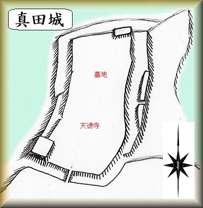 真田城は、天徳寺のある台地先端部に築かれていた。北側に突き出した比高8mほどの台地である。かつては、源頼朝にしたがい、石橋山の合戦で討死した佐奈田与一の居城であったとされていたが、これには明確な根拠はないようである。もっとも真田地区は佐奈田氏の苗字の地であろうから、ここかその周辺に城館を構えていたことは間違いないと思われる。