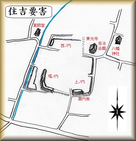 住吉要害は山下の市街地一帯にある。地図には「山下長者屋敷」として掲載されており、南側の民家表の土塁の前には、これについて解説した案内板が立てられている。周辺には八幡神社や東光寺、薬師堂などがあるので、これらを目標にしながら遺構を探してみるのもよいだろう。ただし、城内は3軒の民家の敷地内となっているため、内部見学はできない状況にある。市街地の城址というのは、こういう風になってしまっているケースが多いので、探索には気を遣うこととなる。