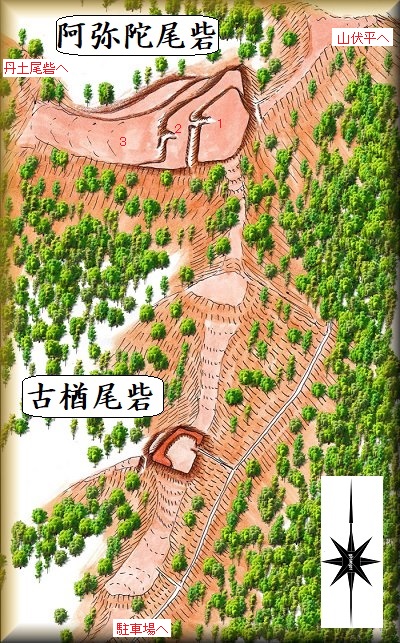 「尾根を降って」と述べたが、この辺りの下りの尾根は方向を見間違えやすく、実際、阿弥陀尾砦から山伏平へ行く途中、何度か道に迷ってしまった。尾根道を降るのにはよほどの慎重さが必要である。丹土尾砦については、尾根伝いに行くよりも、西側の下を通る林道から直接アクセスした方が無難に到達できるかもしれない。