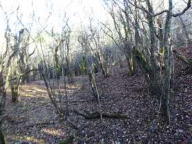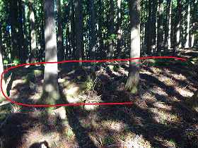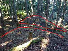 | 山伏平方向からくると、最初に見えてくる2郭下にある堀切。あまり明瞭ではない。 | Bのテラス状部分(右側)の脇を通って、2郭内部に進入していく。 |