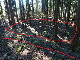 | 山伏平西側の堀切。通路部分を残して両端に竪堀が入っている。 | 山伏平の内部。わりあいまとまった平場があるが、周囲は切岸加工されていない。 |
