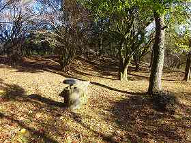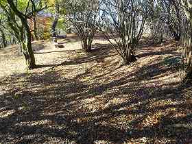 | 古楢尾砦の南側の城塁。あまり鋭くない。 | 砦の内部。ベンチが1つ置かれている。周囲を土塁が廻る。 |