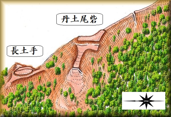 阿弥陀尾砦から、600mほども北西に尾根を降っていったところにある標高633mのピーク部分が丹土尾砦の跡である。そこからさらに比高60mほど北東に降って行ったところに、長土手という構造物もある。