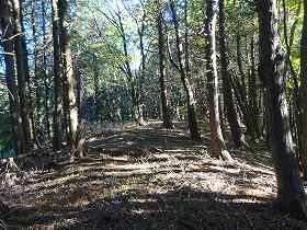 これを進むとすぐに鞍部で道が土橋状に細長くなっている個所に出る。その両脇には竪堀が入れられている。これが西側の堀切である。ここからハイキングコースは、やはり上方へは行かず側面部を経由していくのだが、そのまま尾根をまっすぐ進んでいけば、すぐにピーク部に到達できる。