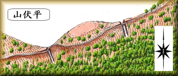 ここから降っていったところに、今度はちゃんと尾根を分断した堀切が存在している。深さ3mほどで幅は5mほどある。これが東側の堀切である。山伏平は、この2本の堀切のみによって区画された空間となっている。