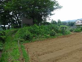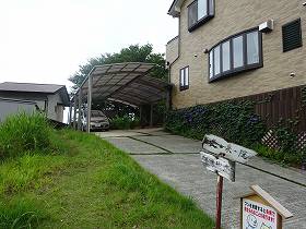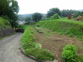 | 城址への入口。案内表示があるがほとんど読めない。一見、民家に入ってしまいそうだが、その脇を通るようになっている。ガレージの後ろが西郭である。 | わずかに残る西郭。手前は堀跡。 |