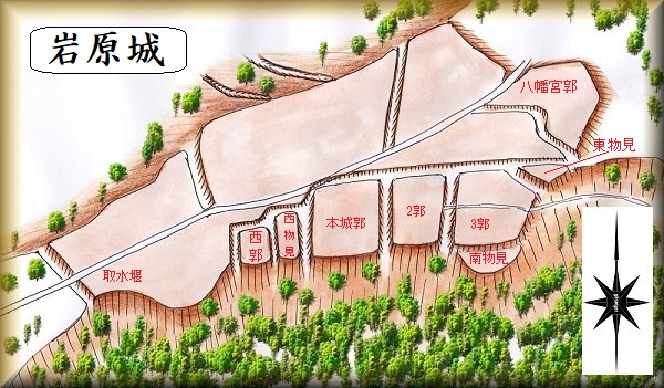 本来の岩原城は、本丸、二の丸、西曲輪が連郭式に並び、それらの間や辺縁部に西物見郭、南物見郭、東物見郭といった郭が配置されていた。物見と称してはいるが、設置されている位置からすると、これらは馬出しであったと見るべきなのではないだろうか。これら全体を囲んで、外郭部が存在していたようである。