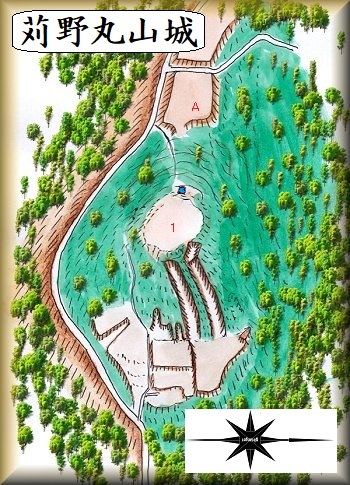 苅野丸山城は、苅野公民館の東南500mほどのところにそびえる比高50mほどの山稜に築かれていた。