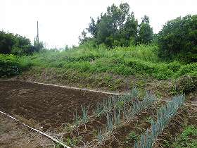 | 1郭へ向かう斜面は傾斜が緩やかな自然地形である。 | 1郭内部。広さはそこそこあるが、切岸加工がまったく施されておらず、天然の地山である。 |
