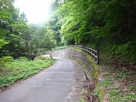 国道138号線のこの分岐点から、山中に入っていく。ここから1kmほど進んでいくと、右手の斜面に手すりが続いている箇所に来る。この部分の上が城址である。