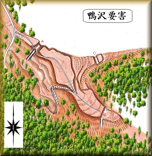 | 鴨沢要害は伊勢宗瑞によって築かれたものである(近年では北条早雲という名称はあまり用いられなくなっている)。永正年間に宗瑞は相模進出を図り、この地に要害を築いて扇谷上杉軍と対峙した。 永正6年(1509)、扇谷上杉氏は、宗瑞を倒すために鴨沢要害に攻撃をかけた。この際、城が落城したかどうかは明らかではないが、その後の宗瑞の相模進出を考えると、城は維持され、相模進出の拠点としてしばらくは維持された可能性が高いのではないかと思われる。 |