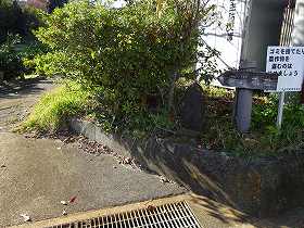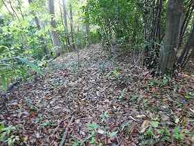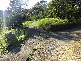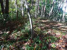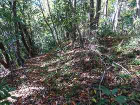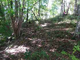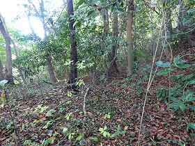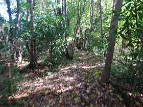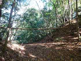 | 道はさらに左に曲がって降り始める。この先の山林が城址である。道が山林に入り下りになるところの左手に、山林内部へと入っていく山道が見えてくる。これを進んでいく。 | するとすぐにAの堀切が見えてくる。 |
