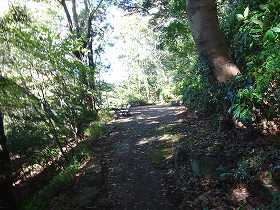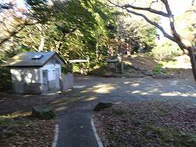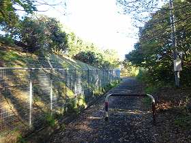 | 城山公園の入口。この脇に管理事務所があり、パンフレットが置いてある。 | その上にある堀切状部分。 |