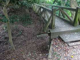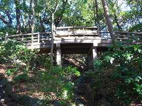 光の広場から城門風の門を通ると、下に降りていく散策路が付けられている。この先には水源地があるようで、そこに国府橋と呼ばれる木橋が架けられている。いかにも堀切に架けられていそうな橋なのであるが、実際には堀切ではなく、小川に架けられたもので、この小川は下方に降っていくと小さな滝状になっている個所もあり、さらに下の不動池まで落ちて行っている。