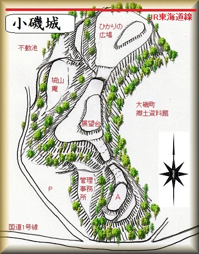 大磯町郷土資料館の西側にそびえている比高20mほどの急峻な山稜が小磯城の跡であると言われ、現在大磯城山公園となっている。それにしても、大磯町にある小磯城というのもややこしいが、小磯城なのに公園名称は大磯城山公園である。公園の住所も「大磯町西小磯大磯城山公園」である。小磯城なのか大磯城なのかよく分からなくなって混乱してしまう。