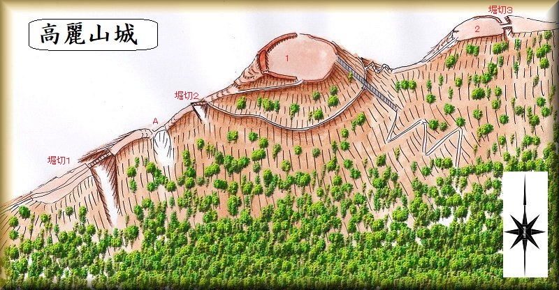 また、この1郭の北西側下には寺窪と呼ばれる平坦地があり、ここにかつて高麗寺が営まれていたという。もともと山岳寺院があったのを利用して城が築かれたもののようである。