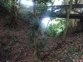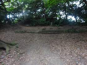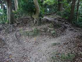 1郭の東側には参道の石段が付けられている。この辺りからいったん尾根を降って北側に登っていったところが、2郭である。2郭の先端部には堀切が設けられ、東側からの敵に備えている。