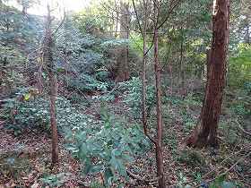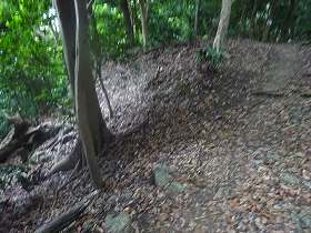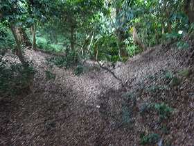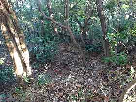 | この堀切を側面部から見たところ。 | その先の尾根にも地形が窪んで両側を削られている個所Aがある。これもかつては堀切だったのであろう。 |
