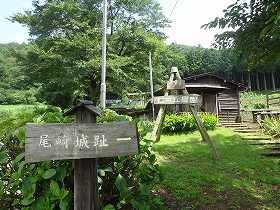 それにしても伏馬田城(尾崎城)は地元の方に愛されている城址のようだ。集落の500m手前の道路脇に「この先5町、尾崎城 城下町」と大書された標柱が立てられているのに始め、山道に入る曲がり角に案内板を設置するなど、あちこちに案内が立てられている。おかげで迷う心配はまるでない。