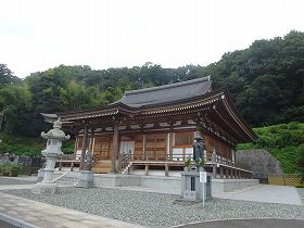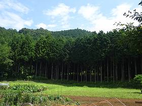 | 宝泉寺本堂。背後の比高50mの山稜が城址である。 | 登城道の途中から寺院のある谷戸部を見たところ。 |