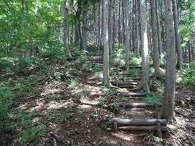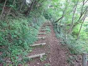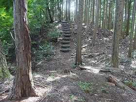| 城址へと続く階段。 | 尾根近くなって主要部の方向の城塁を見てみた。 |