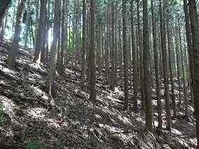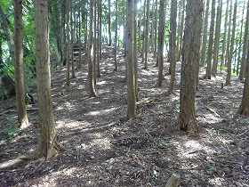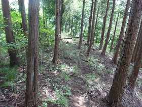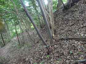 この方向の尾根の側面部には竪堀がいくつか掘られている。しかし、一見して、自然地形なのかどうかはっきりしないものである。南側斜面はかなり急峻になっているので、竪堀が必要だったのかどうか疑問もあり、いわゆる竪堀とはまたちょっと性格がことなっているようでもある。この城の東側と南側は急斜面になっているので、竪堀が必要だったとすれば、むしろ西側斜面にこそ入れるべきであったろう。