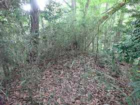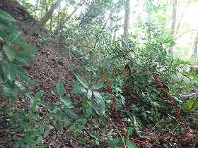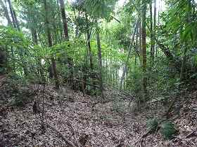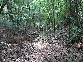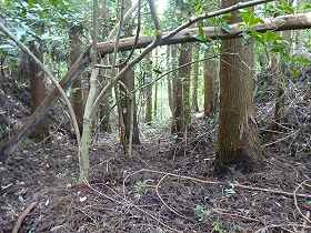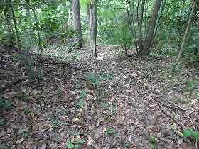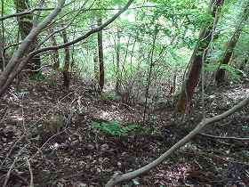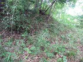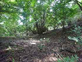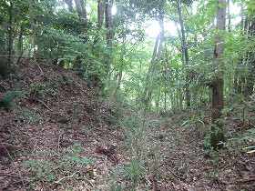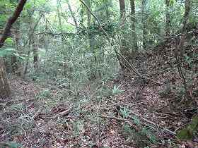 | 2郭の手前の堀切。 | 2郭堀切の側面部。だいぶあいまいな地形になってしまっている。 |