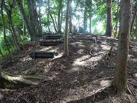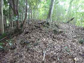 尾根を南側に進んでいくと、すぐに2郭の城塁が見えてくる。その手前には堀切もあるが、だいぶ崩れてしまったようで、深さも鋭さも失われてしまっている。ここに限らず、この城は全体に地形が緩やかになってしまっている。自然崩落しやすい地形なのであろうか。