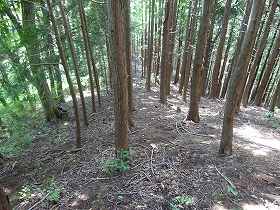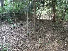 1郭から西側に向かって尾根が続いている。かつては2段ほどの段があったのかもしれないが、こちらも現在は傾斜地形になってしまっているために、あまり明確ではない。尾根はそのまま西側に降って行って、その先が平坦な地形になっている。ここも郭であったろうか。