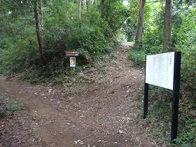 | 土壇の上。削平されたスペースはない。 | 西側の下にある案内板。すぐ背後が堀切4。 |