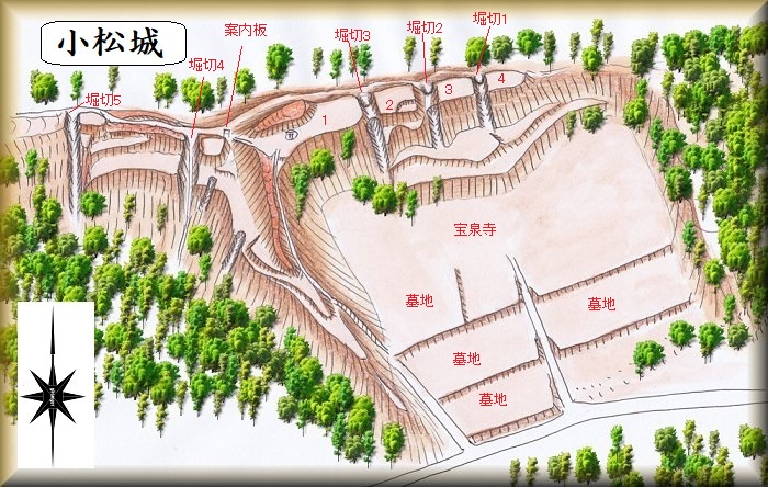 川尻にある宝泉寺の背後の比高50mほどの山稜が小松城の跡であり、googlemapにも掲載されている。