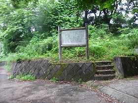 | 本城から新城に向かう途中の尾根。突き当りが1の櫓台。 | 櫓台の前に立てられた案内板。 |