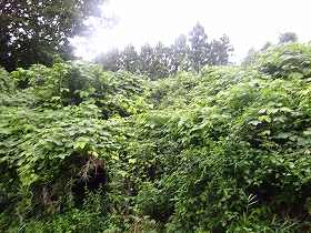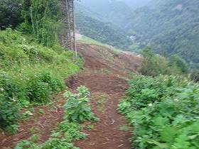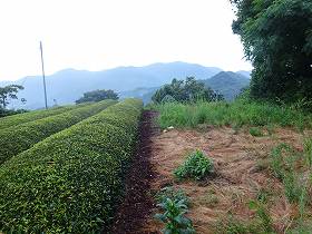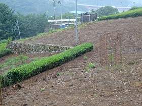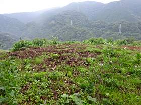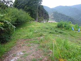 | 本城地区二ノ丸側面部の城塁と堀跡。 | 本城地区の本丸跡。こちらも傾斜地形である。茶畑になっている。 |