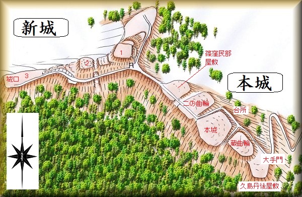 城は「新城」と呼ばれる部分と、古い記録に記載されている「本城」という部分の2つに分かれている。同じ山の中に旧城と新城とが存在していたのであろうか。