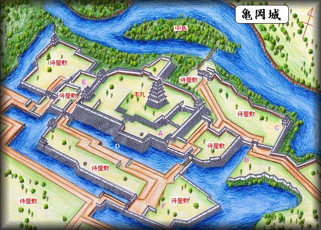 | 亀山城は明智光秀によって天正3年(1575)に築かれたものであった。八上一族らを滅ぼし、丹波一国を手中にした明智光秀がその本拠地として築いた城である。天正10年6月1日夜、明智光秀はこの城を発し、老の坂峠を越えて京都に乱入、本能寺で宿泊中であった織田信長を襲って殺害することになる。 本能寺の変の後、明智光秀が死に城主がいなくなった後、城は羽柴秀吉によって接収され、天正14(1586)年に羽柴秀勝、文禄2(1593)年には小早川秀秋が城主となっている。五層の天守が造営されたのはこの小早川秀秋の時代のことであったという。秀秋が九州博多に転封となり、去っていった後は、前田玄以や石田三成が城代となっている。 関が原の役後、亀山城には岡部長盛が入城した。この岡部氏の時代に、天下普請として亀山城は大改修を受けることとなる。これは大阪の陣を前にして、豊臣家の包囲網の一環として行われたものであると言われる。亀山城が近世城郭として完成をみたのはこの時のことであったろう。 岡部氏の後は近世に入って、大給松平氏、菅沼氏、久世氏などが次々と藩主となって入城した。寛延元(1748)年には、松平信岑が五万石で入城したが、以後は松平氏による治世が続き、明治維新を迎えることとなる。 |