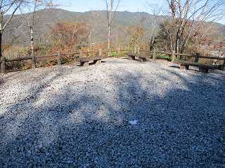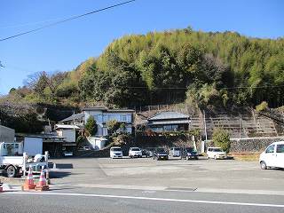 | 東方から遠望する波川城のある山。テレビアンテナが建てられているのが目印となっている。ここからの比高は140mほど。 | ひたすら林道を進んで行って、終点に到着した。主郭手前にある駐車場。腰曲輪の跡であろうか。 |