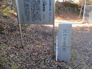 | 城址碑と案内板が設置されている。「波川玄蕃城跡」とある。 | 1郭土塁。 |