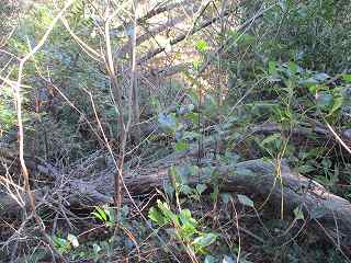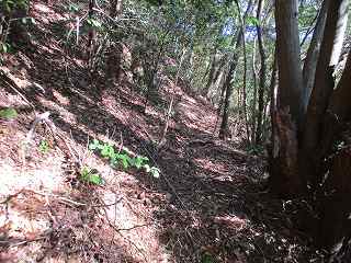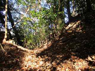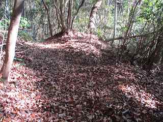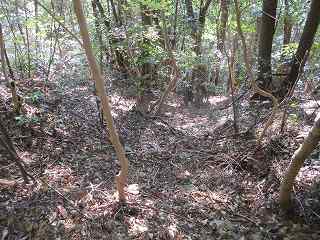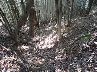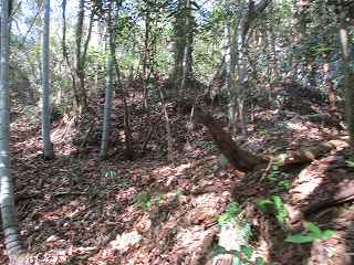 | この辺りから城の郭のようだ。 | 2郭下の大きな竪堀。 |