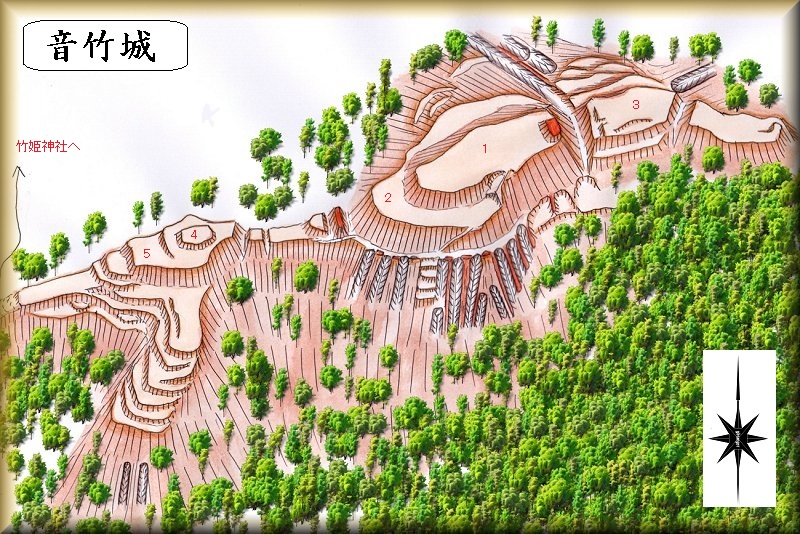 | これだけの規模でありながら、音竹城の城主等歴史についてはよく分かっていない。 伝承では南北朝時代の築城とされ、音竹千代、竹姫らの名前が伝えられているが、あくまでも伝承上のことである。 さらに甫岐長門守の居城であったという伝承もあるが、これについても詳しいことはよく分かっていない。 |