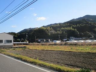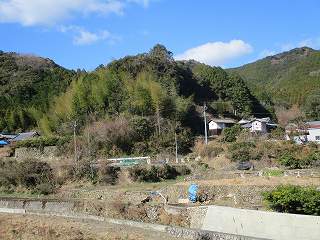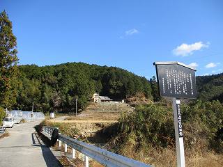 | 西方から遠望する別役城。竈神社の祭られている比高20mほどの山稜先端部である。 | 東側の尾根続きの道路脇にある案内板。ここから入って行く。 |