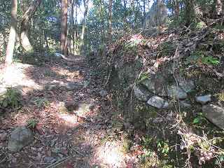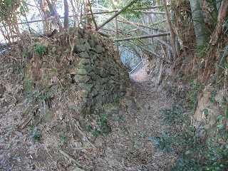 そこから登って行くとすぐに3郭との間の堀切状地形に到達し、その部分に上がる通路の下には石積みがされているのが分かる。