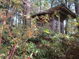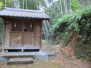 ヤブをかき分け掻き分け進んで行くと、その奥に建物が見えている。これが八幡神社のようだが、この状況を見ると、現在では参詣に来る人もいなくなってしまっているのであろう。