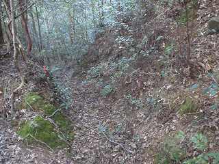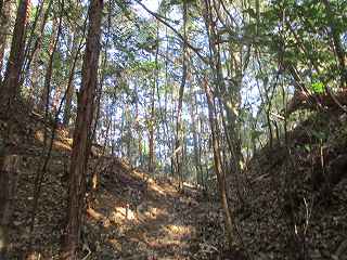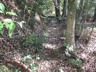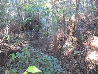 | すると阿弥陀堂がある。この左手から登城道が付けられている。 | 登城道の途中に見える竪堀。5郭と6郭との間の堀切から続いているもの。 |