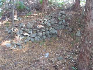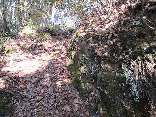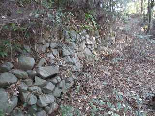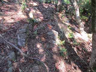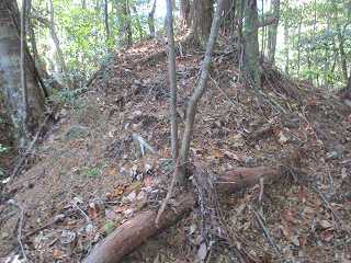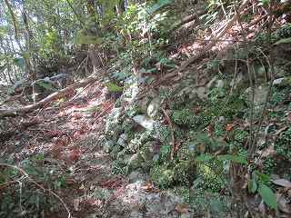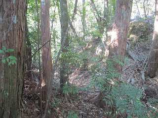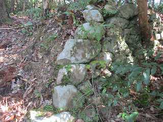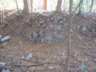 | 2郭虎口脇の石積み。 | 尾根続きの堀切跡と思われる箇所。 |